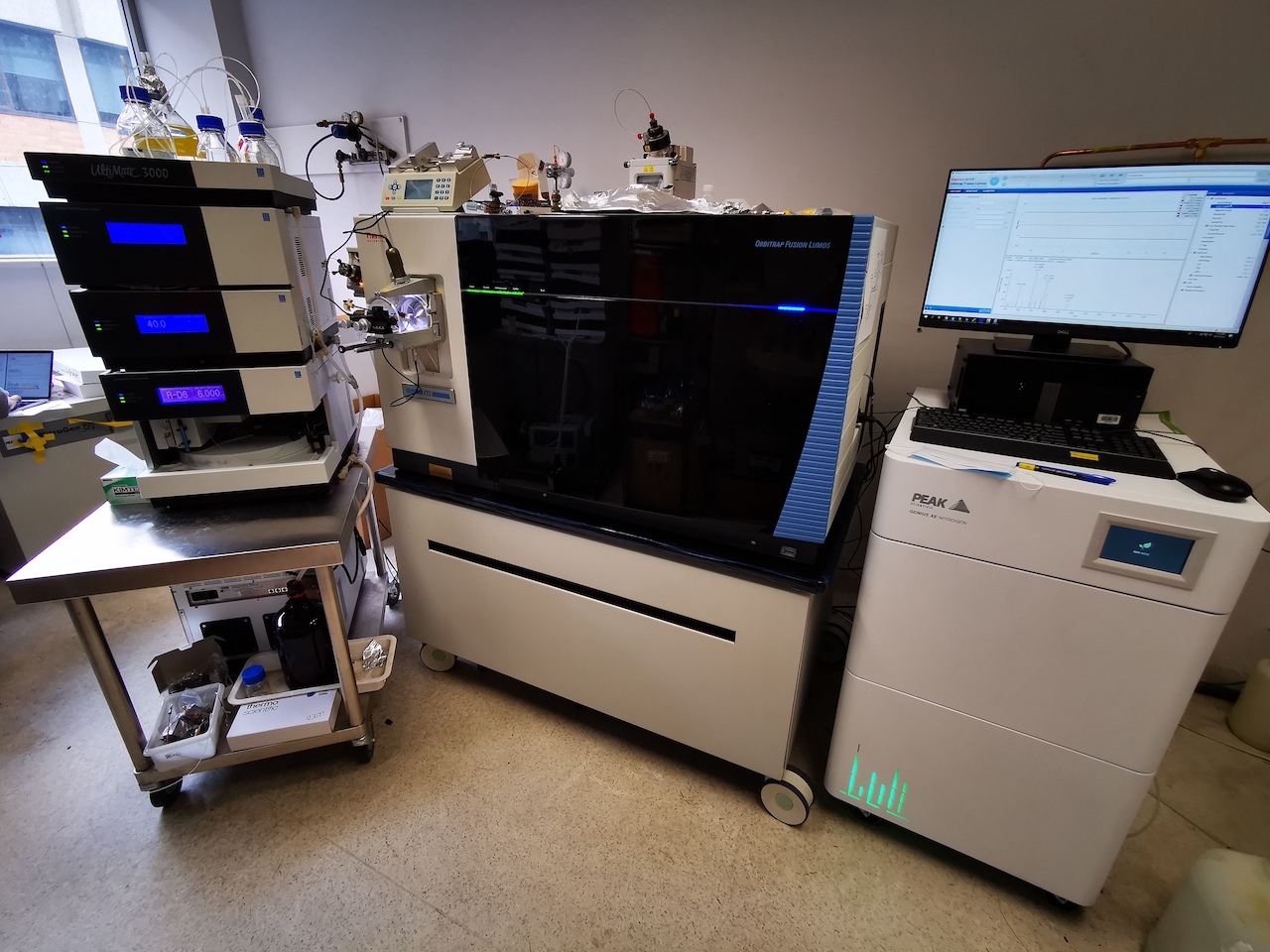 Thermo Ultimate 3000 nanoLC coupled with Orbitrap Fusion Lumos (with EasyIC and ETD): discovery preoteomics & quantitative proteomics Agilent 1260 HPLC coupled with Sciex 5600 QTOF: discovery proteomics and molecular weight analysis of recombinant protein Software: Proteome Discoverer offers multiple integrated tools for statistical and biological interpretation to quickly turn data into insights. Maxquant is a quantitative proteomics software package designed for analyzing large mass-spectrometric data sets. Skyline provides state of the art modeling, analytics, and visualization software to produce highly accurate and visually stunning 2D and 3D products.